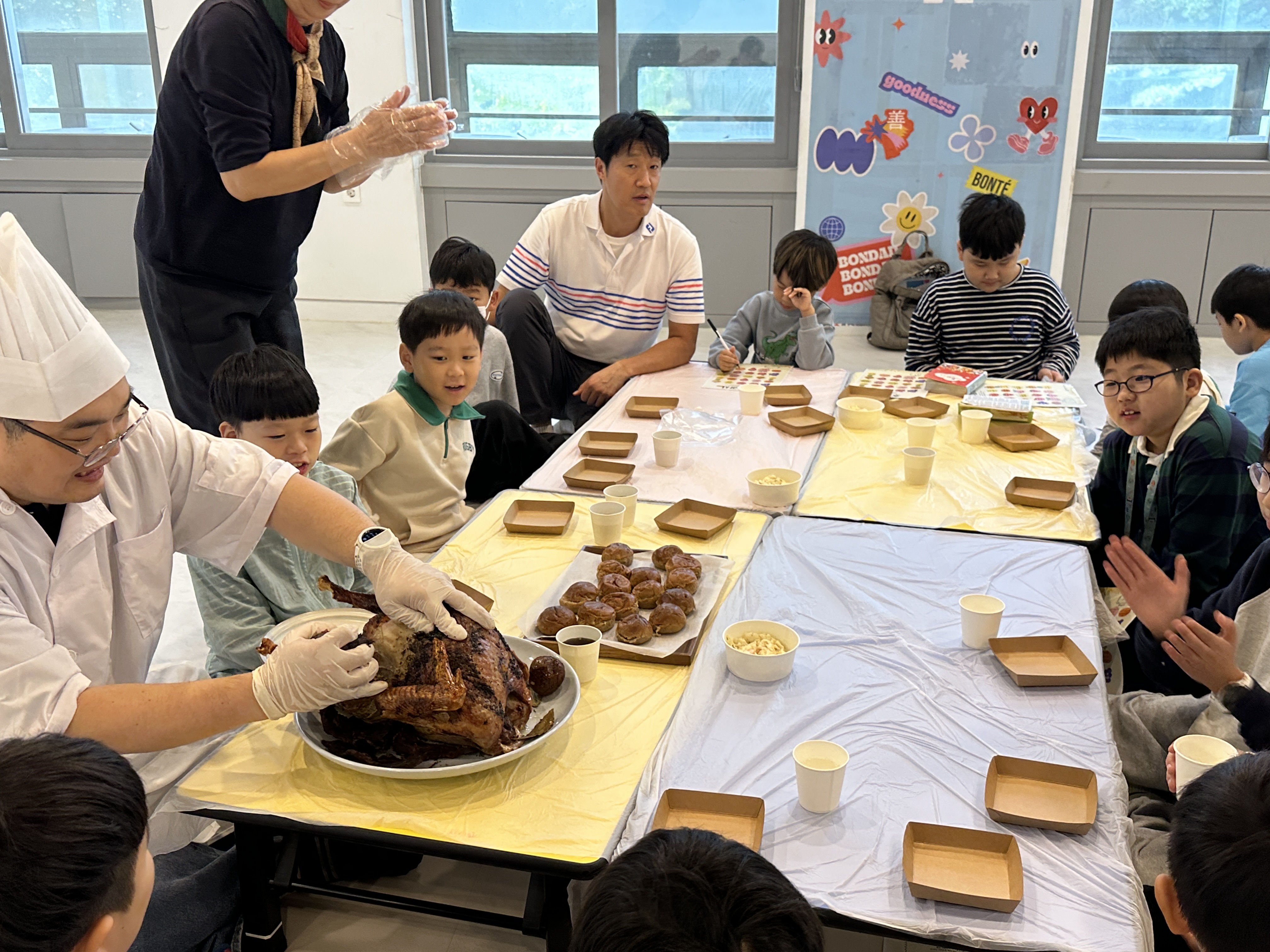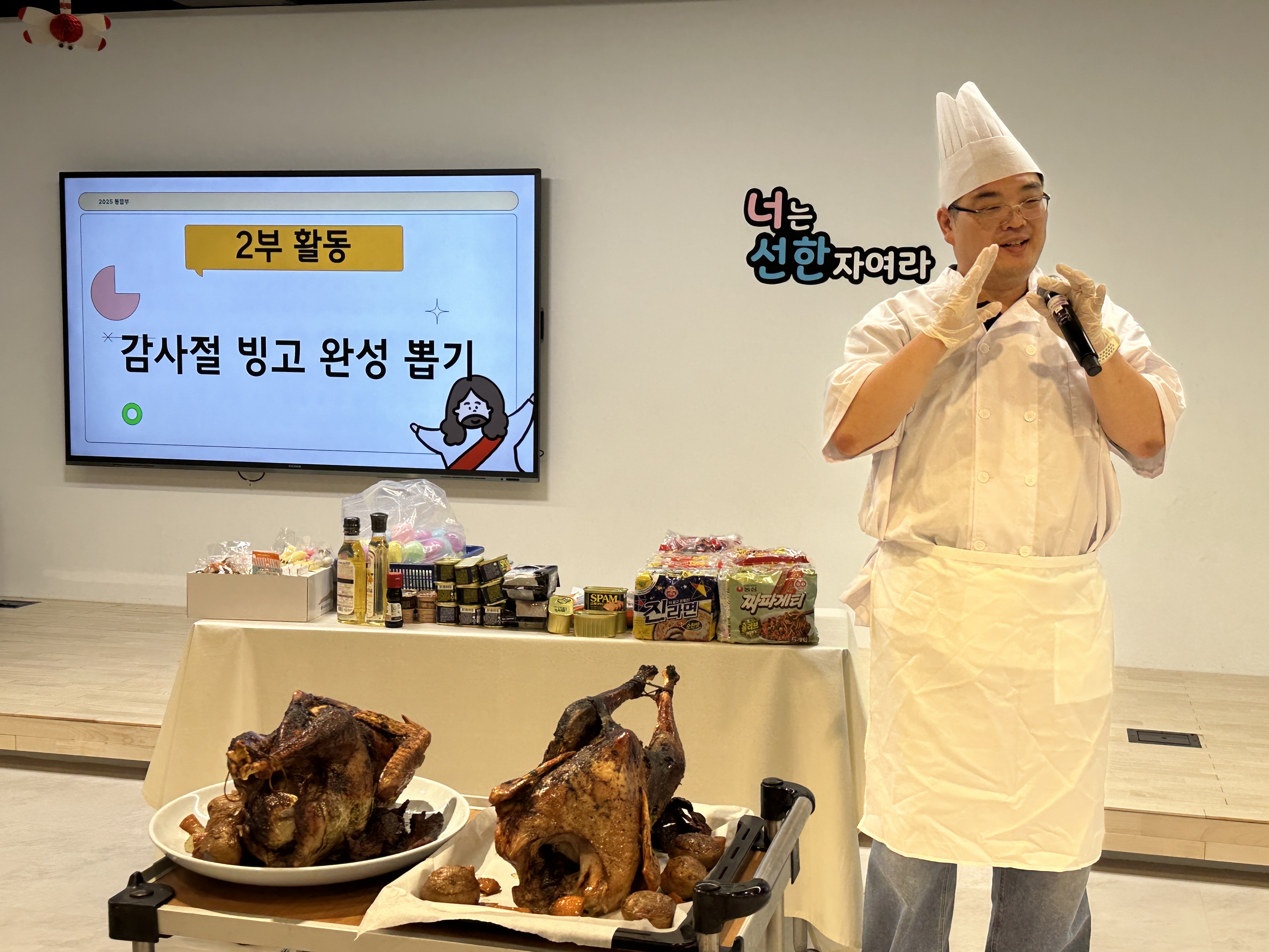 🍂 통합부 추수감사주일 🍗 어린이교회 / 2025-10-19 14:10 / view : 18 김형통 통합부 추수감사주일 추수감사절을 맞이하여 통합부 추수감사 주일을 드렸습니다. 6시간동안 구운 칠면조를 먹고 한해를 돌아보며 하나님께 감사하는 시간을 가졌습니다. (보존식품으로 드린 추수감사 예물) (통합부 간식 선생님이신 이영민, 장동희 선생님)