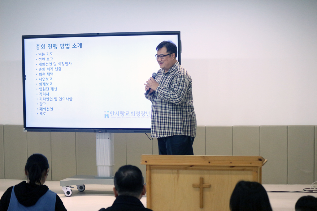 총회 진행을 맡은 청장년선교회장 이영민 집사는 총회 순서와 의미를 알려드리고자 하였습니다.