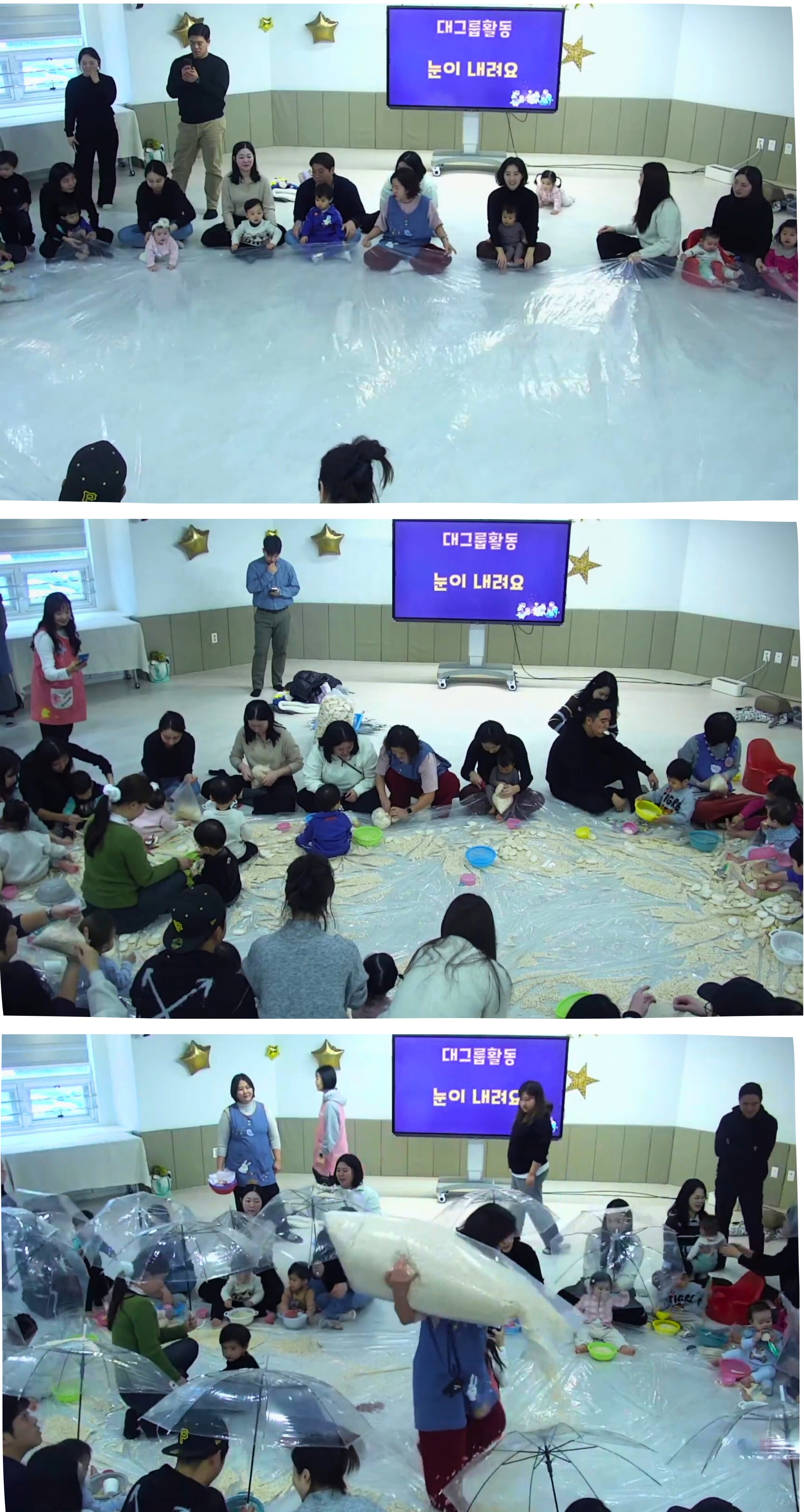 - 그리고, 고소하고 특별한 은혜의 눈이 내렸어요! 예수님께서 주시는 풍성한 사랑처럼 하얀 눈(고소한 뻥튀기)이 예배실에 가득 내렸지요. 우산 위로 톡톡 떨어지는 눈소리를 들으며 하나님의 세심하신 돌보심을 느껴 보았어요. 하얀 눈을 손으로 만지고, 발로 밟고 입으로 냠냠 맛보며, 하나님의 사랑이 얼마나 풍성하고 달콤하지를 온몸으로 고백했답니다. 비닐 주머니에 눈을 가득 담아 눈사람도 만들었어요. 이 눈사람처럼 우리 마음도 예수님의 사랑으로 가득 채워졌겠죠?