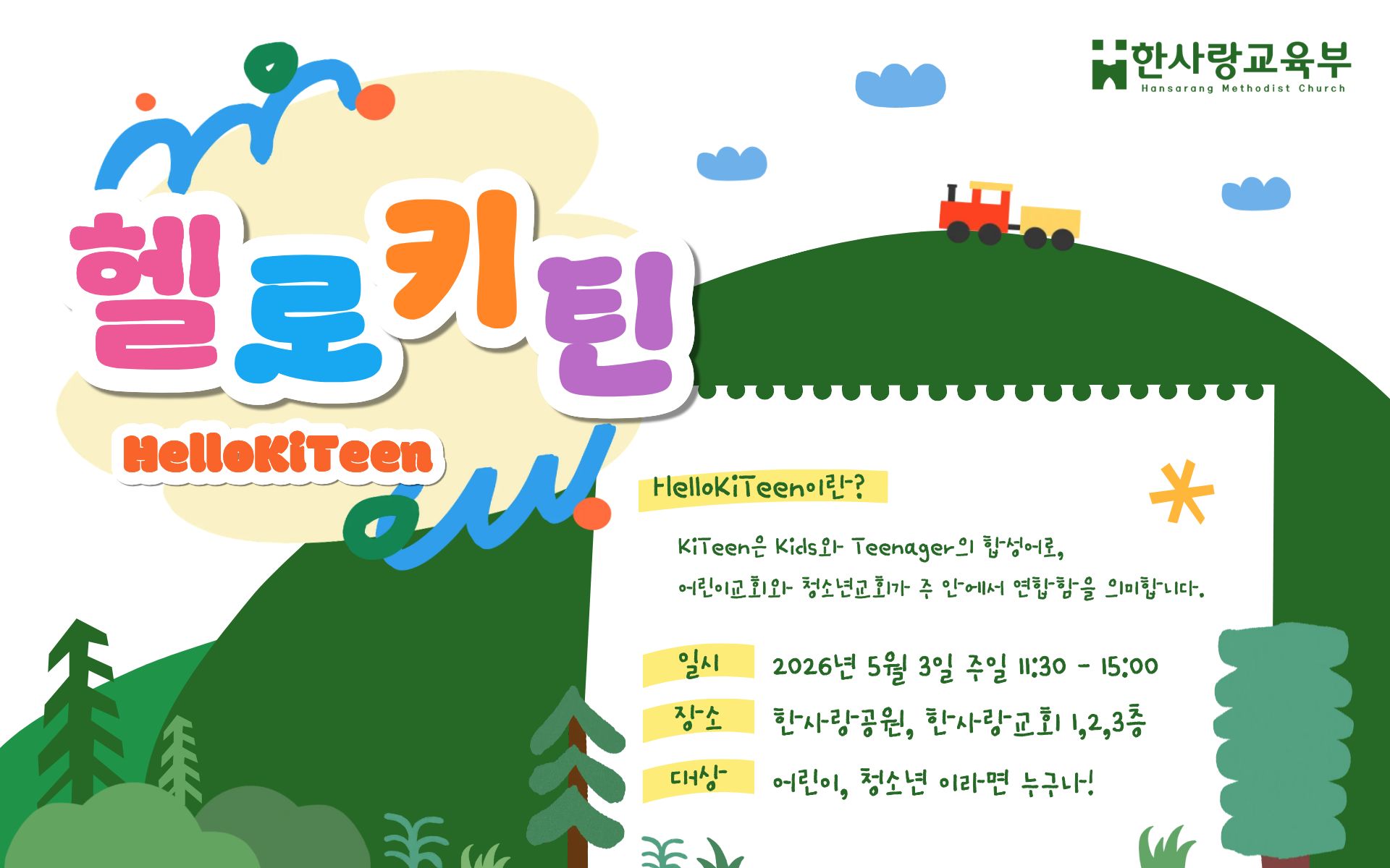 5월 3일 어린이 주일 헬로키틴 한사랑블로그 / 2026-04-17 14:04 / view : 16 sarang han 어린이·청소년교회 Hello Kiteen 일시: 5월 3일(주일)장소: 한사랑공원, 한사랑교회(1,2,3층)교육부 전세대 축제 Hello Kiteen이 5월 3일 주일 오전 11시 30분에 한사랑공원과 교회 1,2,3층에서 열립니다. 다양한 놀이와 맛있는 간식 그리고 즐거움이 가득한 시간에 어린이와 청소년 여러분을 초대합니다.