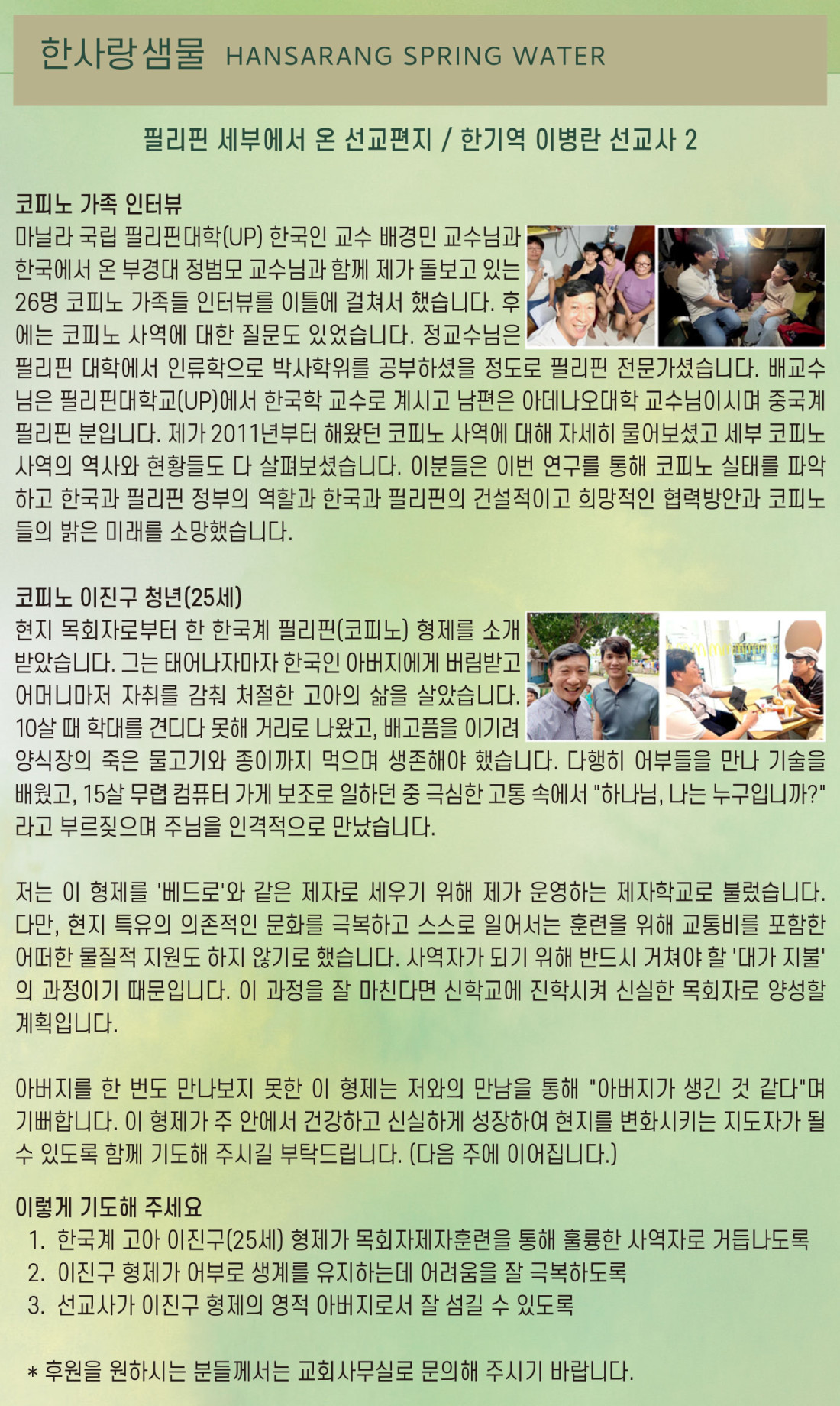 함께 하나님의 말씀을 묵상하며, 하나님의 마음에 이어지는 자가 되어 신앙의 선배들이 지켜온 믿음과 선교의 사명이 다음 세대에게 이어지도록 하는 한사랑 공동체가 되길 소망합니다.