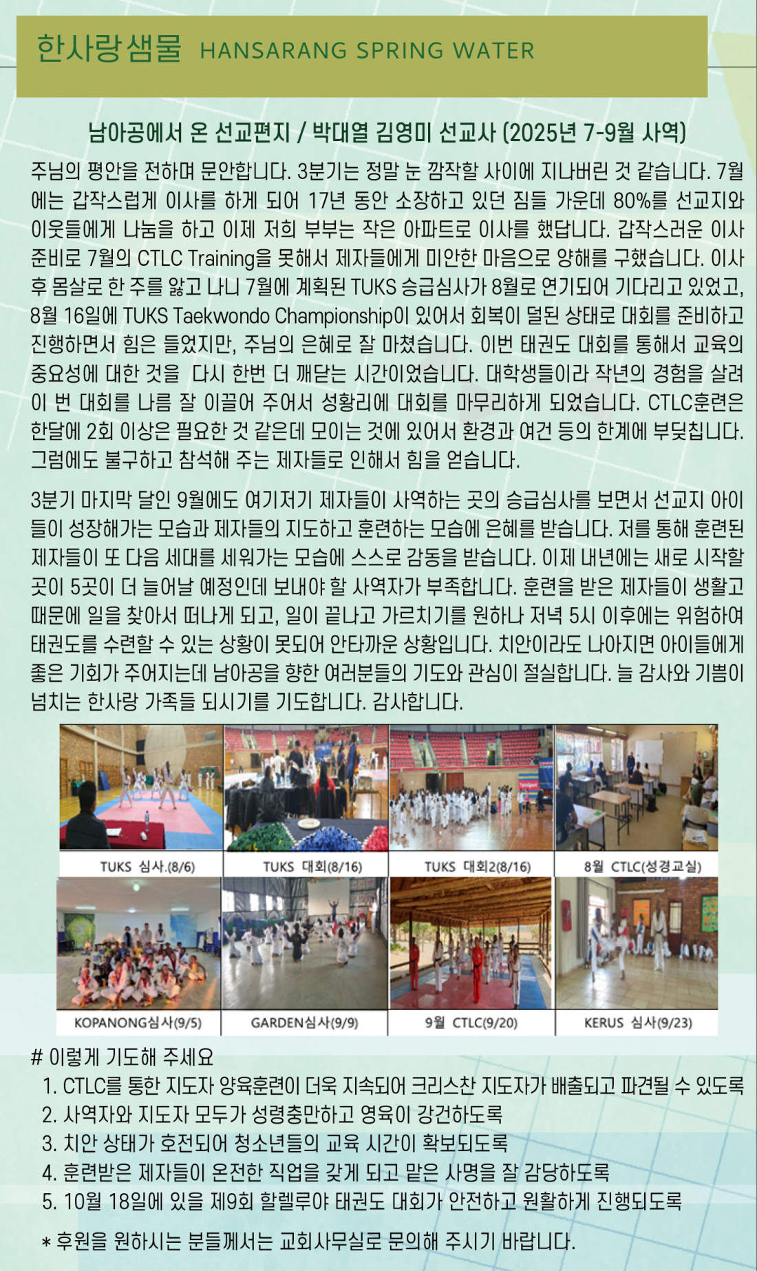 · 제출기한 및 장소 : 10월 19일(주일)까지 / 한사랑교회 로비