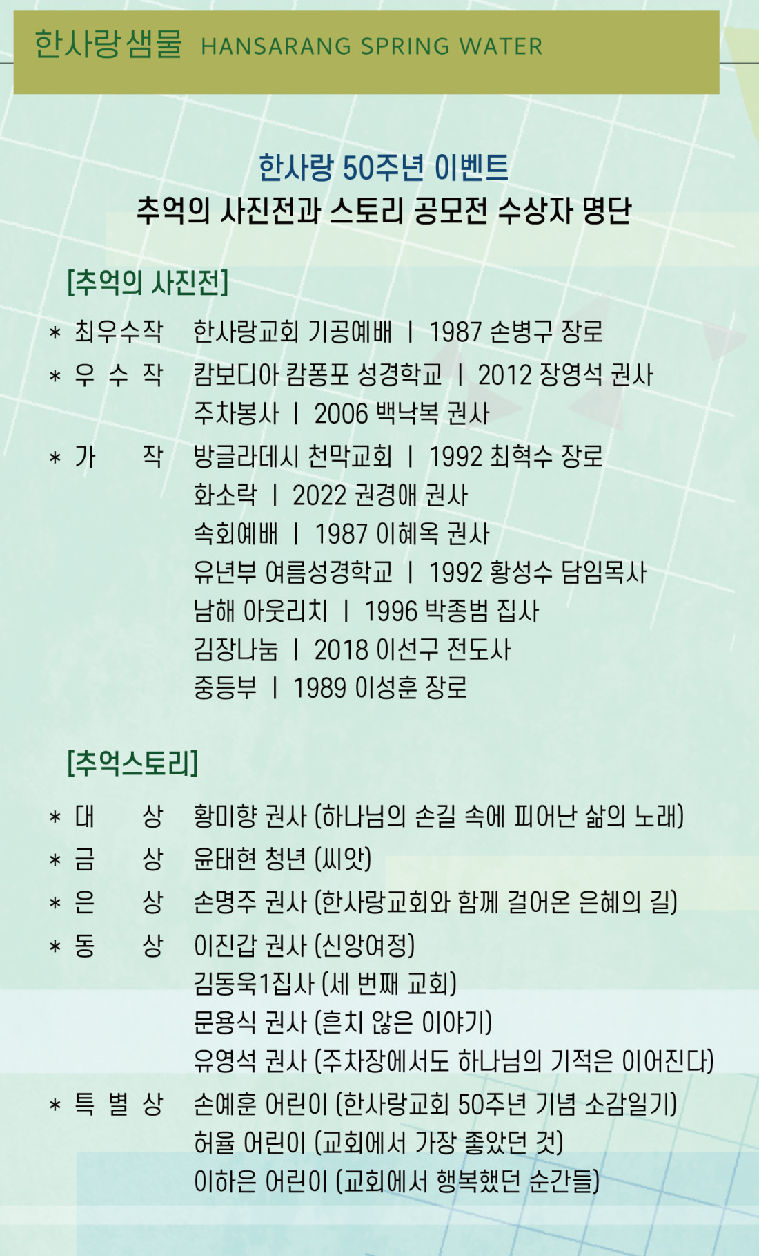 2. 오늘 3부예배에 「한사랑 50주년 이벤트, 추억의 사진전과 스토리 공모전 시상식」이 있습니다.